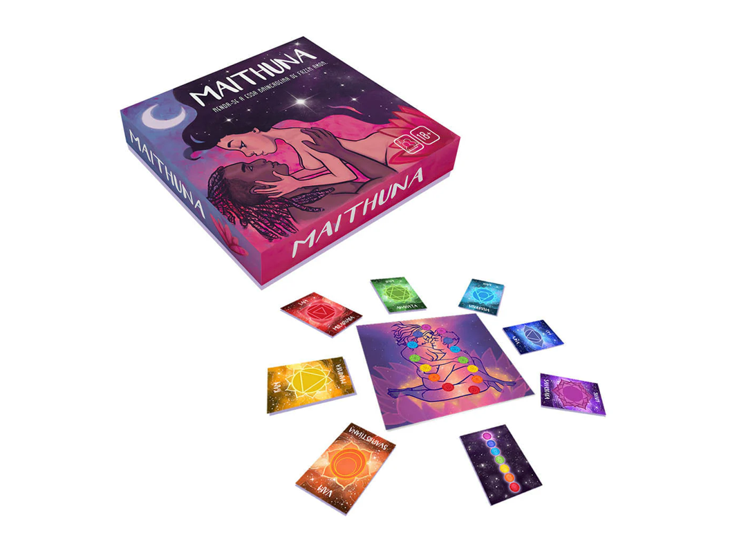 Maithuna é muito mais divertido que terapia de casal. São muitas possibilidades no jogo que usa cartas como peças centrais, Conheça algumas. As 49 cartas da verdade dão voz ao jogo e exploram questões relacionadas à cada chakra: Muladhara, Svadhisthana, Manipura, Anahata, Vishuddha, Ajña e Sahasrara. E ainda tem as 14 cartas-desafio que enriquecem a experiência de forma sensorial; sentir é a chave do jogo. Maithuna tem como base oferecer ao casal mais prazer, mais conexão e mais diversão. Maithuna não é um jogo de performance sexual. É sobre intimidade, a excitante aventura de se revelar e desvendar o outro.